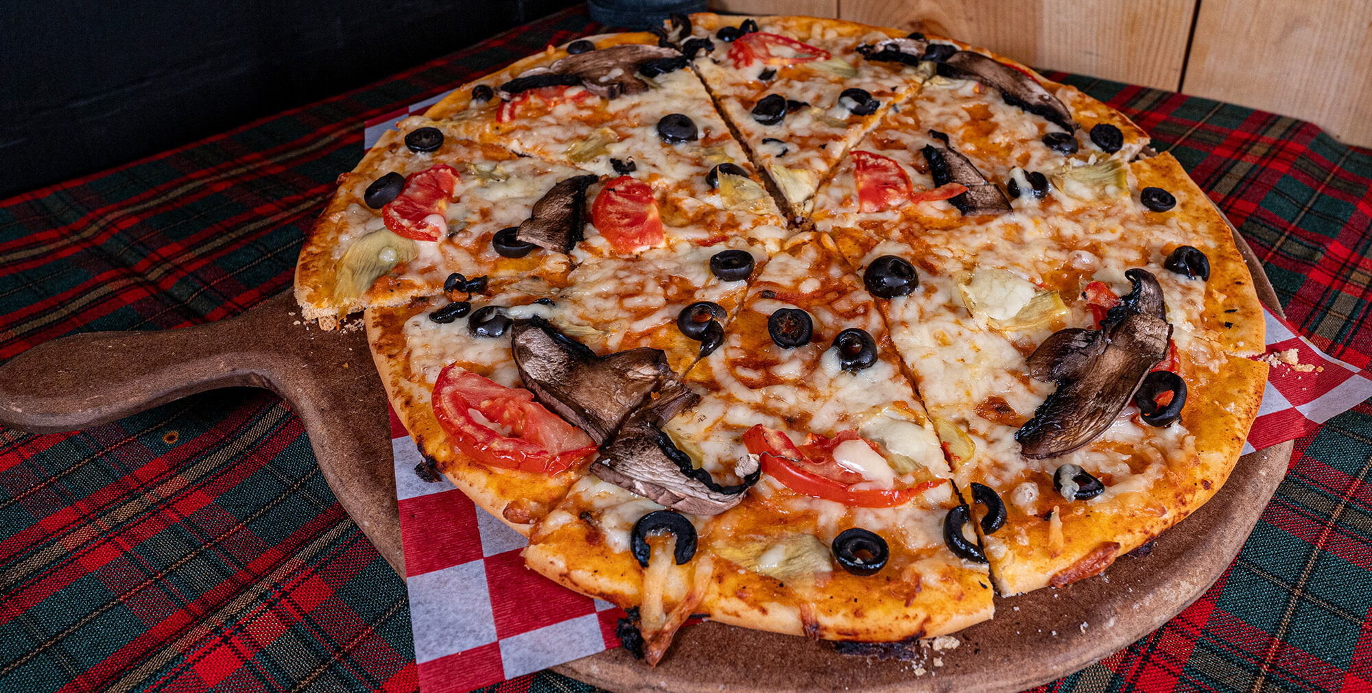 Alcachpfa, tomate, aceitunas negras, portobellos y doble queso