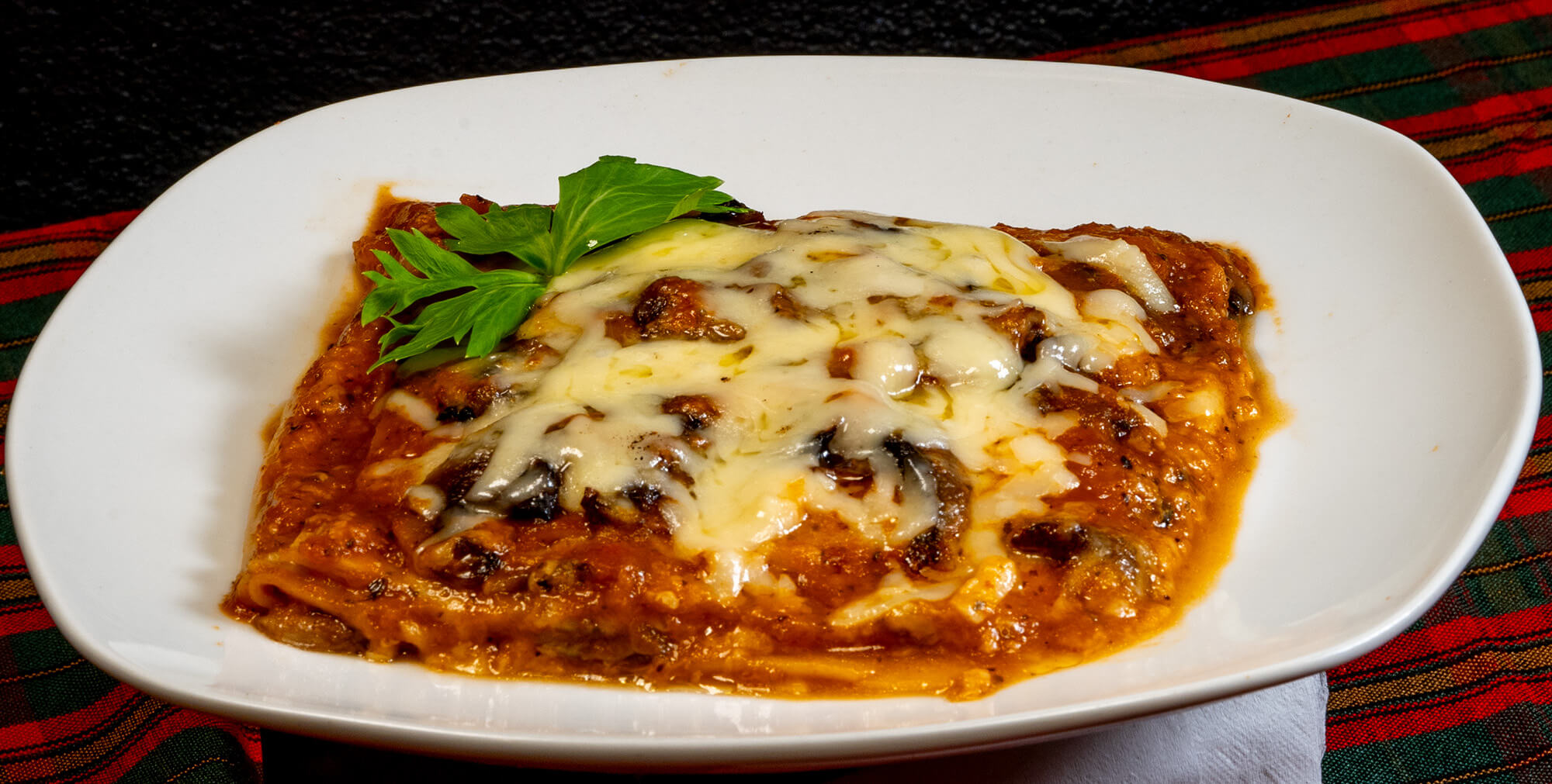 Lajas de pasta con champiñones bañados en salsa y queso doble.