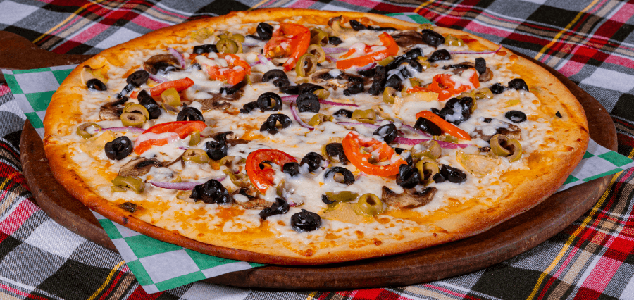 Alcachofa, champiñones, aceitunas verdes, acetiunas negras, cebolla morada, rodajas de tomate y doble queso.