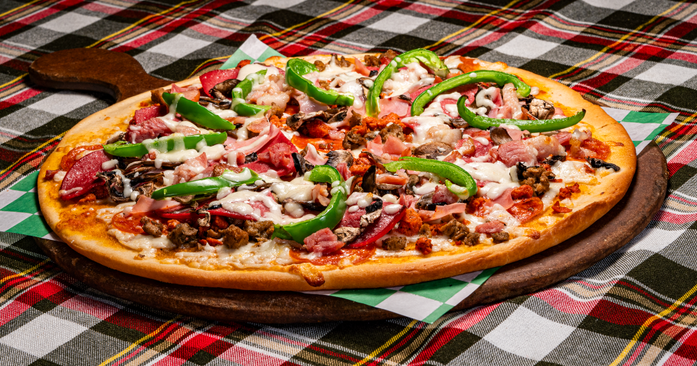 Pepperoni, salami, chorizo, jamón, champiñones, tocino, morrón y doble queso